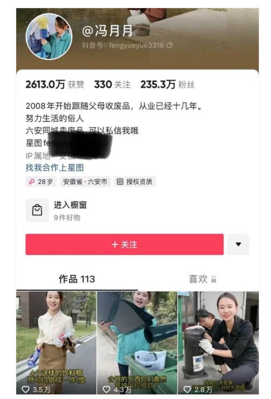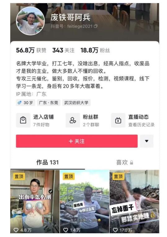 线下的情况我大致摸清楚了,我想线上一定有人已经在布局了,于是经过一晚上的研究,我发现了三个关于废品回收的大ip,果然是什么生意都能搬到D音上来做。