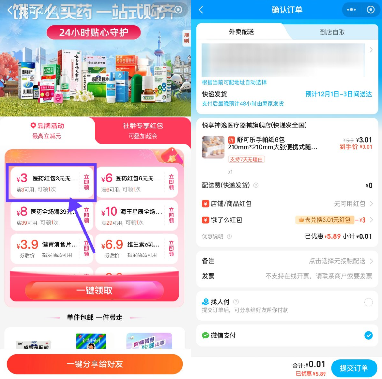 饿了么医药领3亓券0亓撸实物