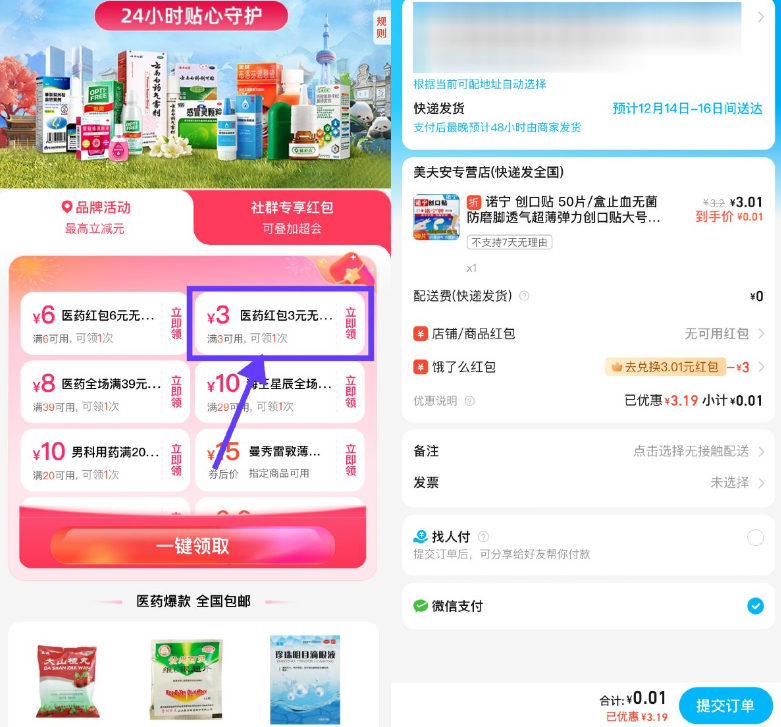 微信打开活动->先领3亓医药神券->直接拍下创口贴或者口罩