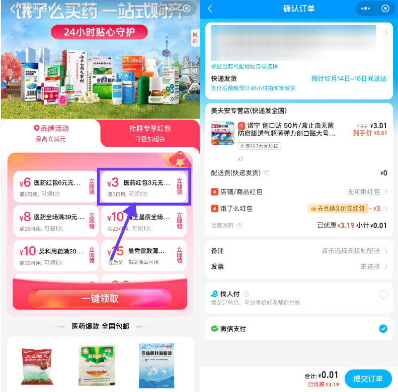 微信打开活动->先领3亓医药神券->直接拍下创口贴或者口罩