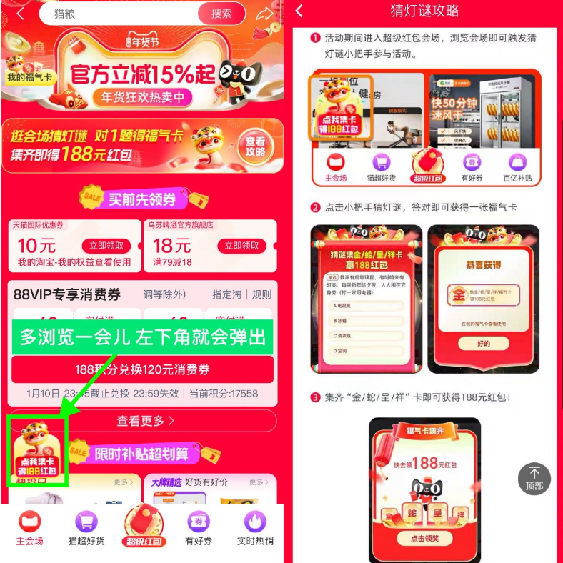 淘宝搜索“红包要要要”->当前页面多浏览一段时间,左下角弹“点我集卡”猜灯谜->集齐金/蛇/呈/祥必得188亓红包