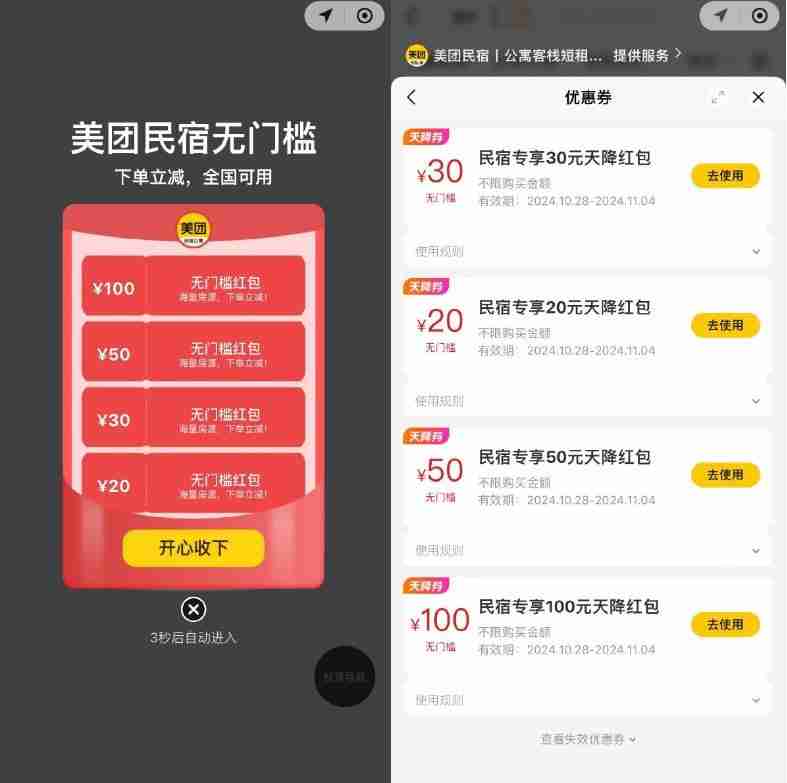 美团民宿领100元无门槛抵扣券