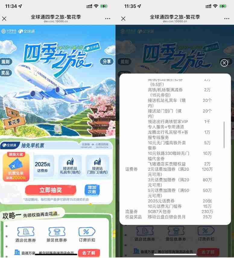 移动全球通繁花季抽话费券等