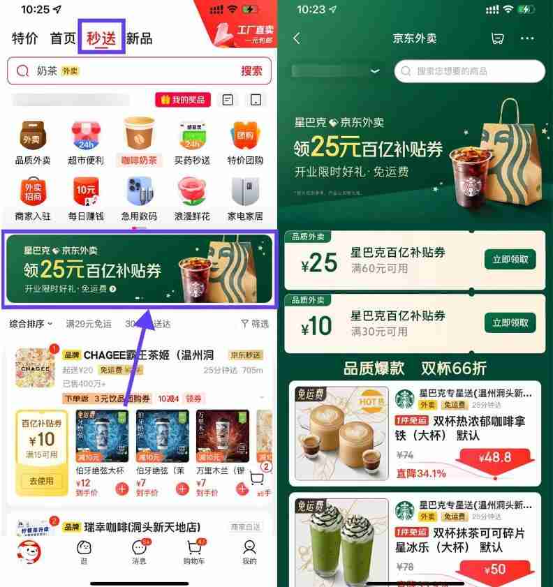 京东秒送领星巴克60减25亓券