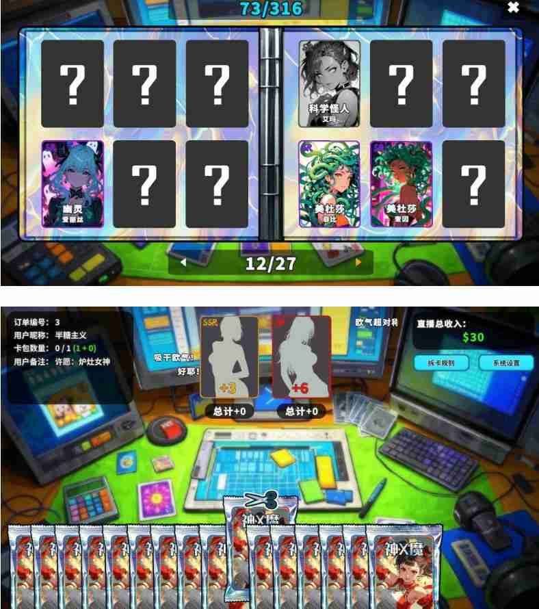 你将扮演一名直播间的拆卡包主播,根据客户订单进行拆卡包的直播。直播盈亏收益全看你的选择和运气,另外你也可以自己参与其中,收集全套卡册。