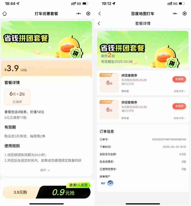 百度0.9亓拼团买2张6亓打车券
