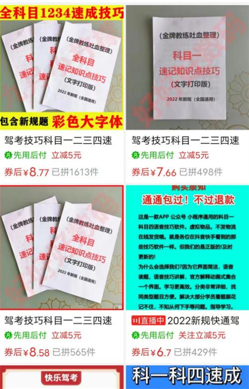 一个万能的方法,去某多、某宝搜索一下你就知道了。主要搜索关键词为“考驾照”,出来的结果是考驾照的题目资料。