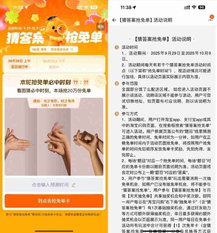 淘宝搜索“猜答案抢免单”->每天有2场活动,根据提示猜时间,准点即可抢20万张免单卡
