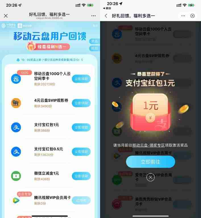 跳转到移动云盘APP->直接领0.5~2亓红包或立减金