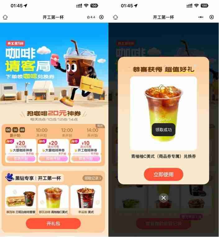 微信打开活动->今天8/10/12/14点整抢20-20亓咖啡神券,黑钻用户还能直接领咖啡免单券