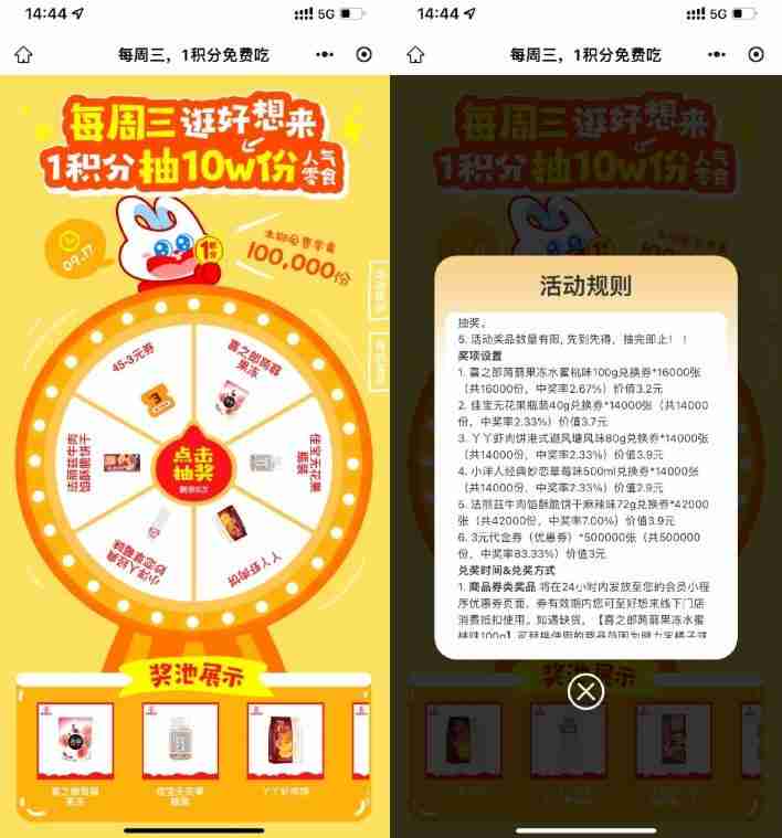 微信打开活动->每周三可用1积分兑换1次机会,抽10万份免费零食 到店核销即可