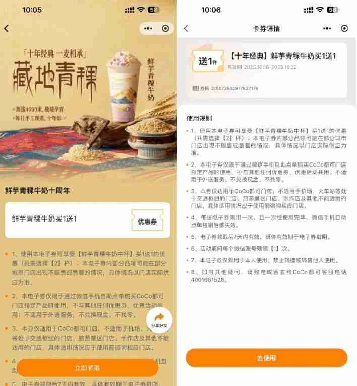 微信打开活动->直接领鲜芋青稞牛奶买1送1券