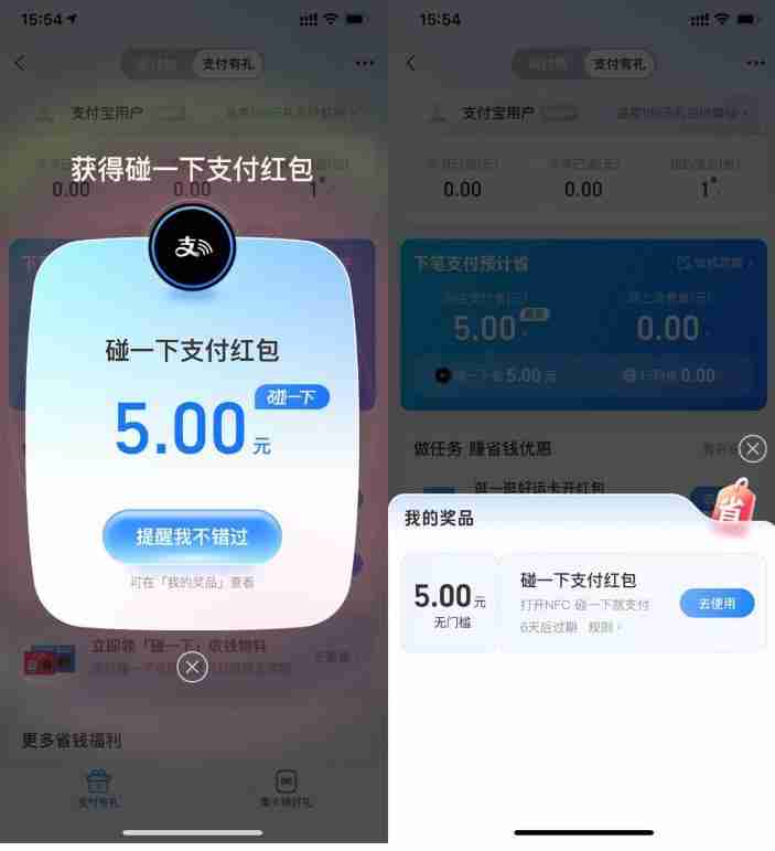 支付宝搜索“支付有礼”->部分人弹5亓碰一下红包 或 多次支付券包,每周五加码领大额红包
