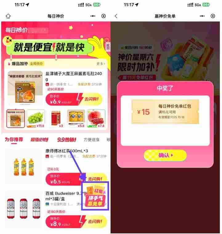 微信打开活动->点右下角浮窗进入,抽15-15亓闪购免单券