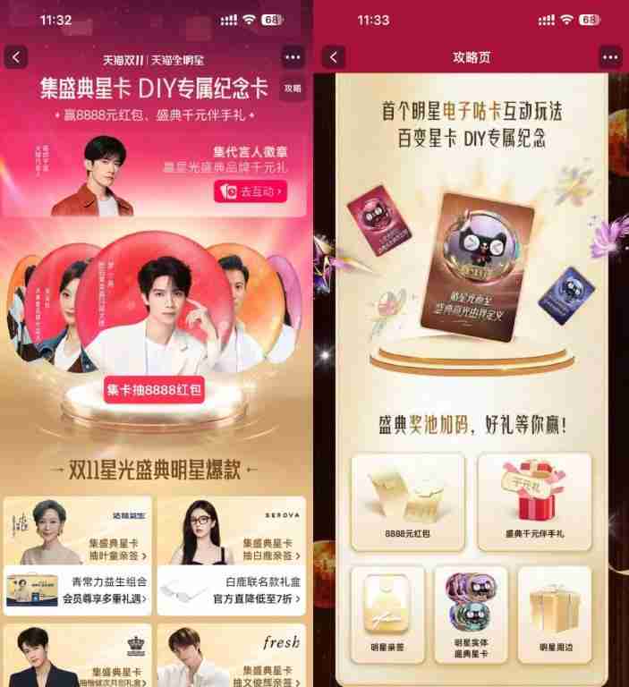 淘宝搜索“天猫全明星”->每天浏览和搜索明星得卡片->每个明星集齐7张卡或每抽卡10次红包或实物等奖励