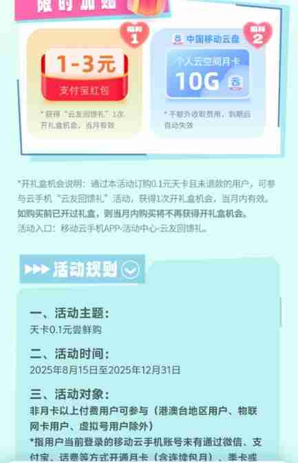 【活动规则】参加移动云手机举办的0.1元购天卡开惊喜礼盒抽最高3元支付宝红包活动,通过打开微信进去活动里,登陆后支付0.1元购买天卡就可以抽奖1次,有机会中到1-3元支付宝红包,这个活动全国三网手机号码都可以去。