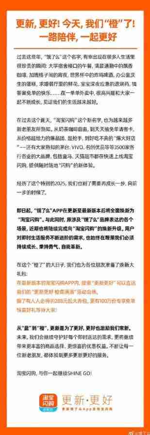 12月5日,淘宝闪购官方微博账号发文:“更新,更好!今天,我们“橙”了!” 值得注意的是,淘宝闪购官方微博账号