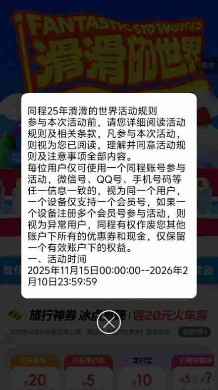 【活动规则】每位用户仅可使用一个同程账号参与活动,微信号、QQ号、手机号码等任一信息一致的,视为同一个用户,一个设备仅支持一个会员号,如果一个设备注册多个会员号参与活动,则视为异常用户,同程有权作废您其他账户下所有的优惠券和现金,仅保留一个有效账户下的权益。