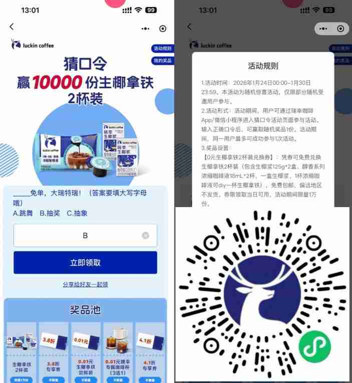 瑞幸抽1万份0.01亓实物免单