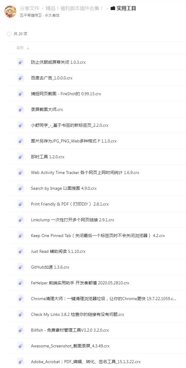 包含广告拦截插件AdGuard、护眼神器、破解复制、奇妙体验、实用工具、搜索神器、下载神器、油猴插件(内附福利脚本)、在线查词等,