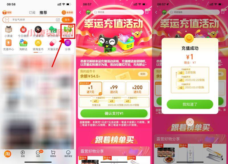 新一期!淘宝首页“天猫超市”->搜索“幸运充值”->充1元猫超卡额外送3张天猫超市卡(每个人显示的都不一样)每周自动到账一张
