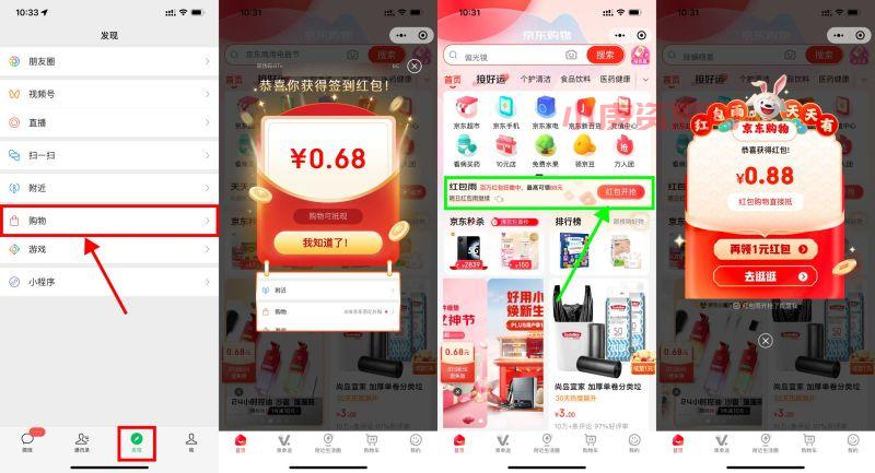 844C825A-8A2E-4899-B524-36F8AF285C1E.jpeg微信底部“发现”->购物->自动弹出签到红包->再点击红包雨抽0.88元红包