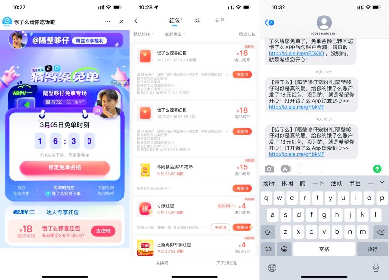 抖音抽饿了么38减18元外卖券