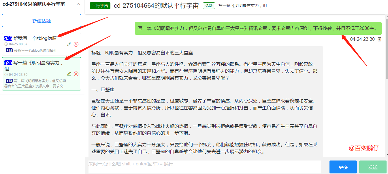 不止可以写文章还可以写代码,平台也不是鹏仔本人的,只是偶然找到的网站,看平时很多资源网都在发布gpt的源码,但是能分享出的源码基本不能用,或者bug多多,还不如分享个给力的去使用。