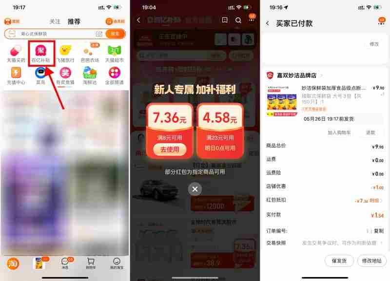 淘宝APP首页“百亿补贴”->新用户自动弹出2个购物红包,一个今日可用 一个次日可用->在百亿补贴频道搜索自己想买的实物即可抵扣
