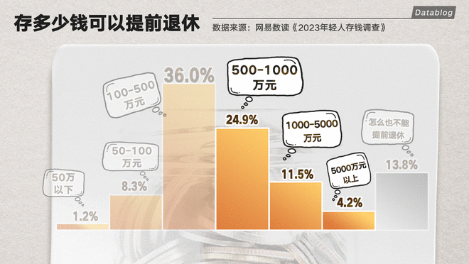 还有 21.7% 的人和我一样,每天上班都想着,什么时候才能攒够钱把老板给炒了。但真要让他们给自己的 “FIRE 生活”(Financial Independence, Retire Early,意为 “经济独立,提前退休”)定个目标,超过四成人选择存够 500 万以上,这答案又显得过于遥不可及。