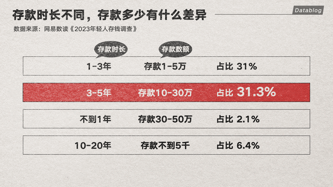 存钱的时长也很重要,大约三分之一的人能在 1 到 3 年内存到一万元,要存到十万则须 3 到 5 年。而要想达到百万存款,没有十几、二十年很难做到。