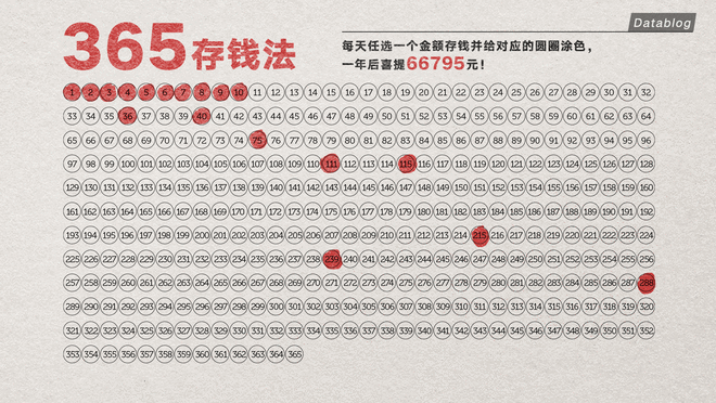 互联网上流行了很久的 “365 存钱法”,是让人每天从 1 到 365 中任选一个金额存钱,在数字不重复的情况下,坚持一年,就能喜提 66795 元存款。