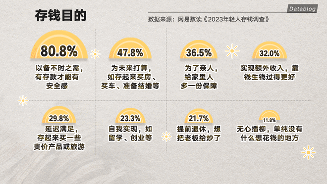 调查结果显示,大家存钱最主要的原因是为了给自己安全感。有人说,一直以为父母永远不会老,直到前两年爸爸做了两次手术,突然意识到需要存钱来面对未来的不确定性。