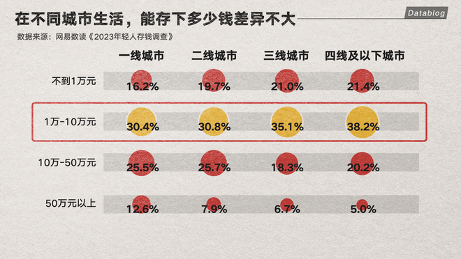 让人比较意外的是,不同城市大家的存款区间分布并没有显著的差异。即便是在一线城市,不到 10 万元的存款也是主流。