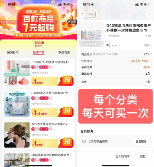 淘宝天降福利1元撸实物包邮