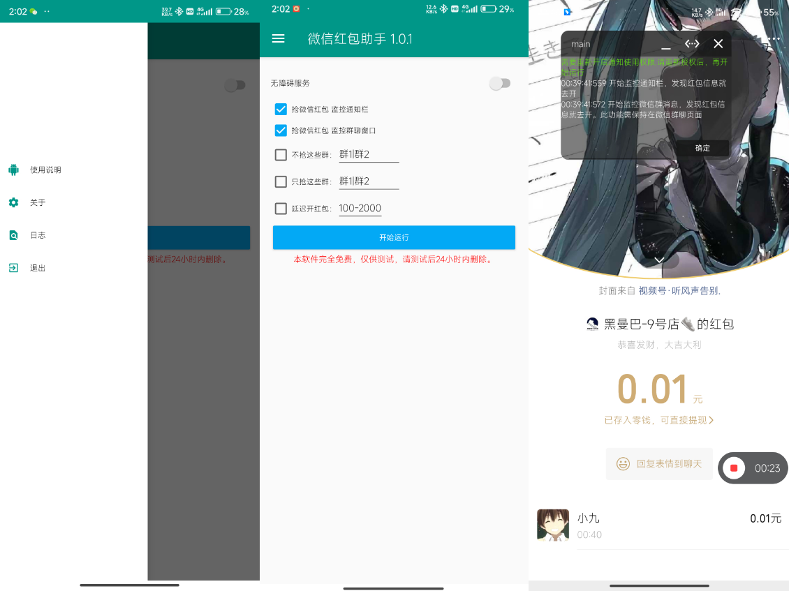 【软件说明】:红包每逢大小节日必有抢红包节目,现在不用再担心眼睛死死盯着手机屏幕,结果屏幕快撮碎了都抢不到红包的问题啦,只需一键设置就可以尽情的在微信群抢红包了,软件完全免费!优点①多功能结合,节省内存,减少手机内存消耗;②辅助抢红包,不放过任何一个红包;③协助手机充电管理,有效充电保护电池,延长手机电池健康。⬇️下载地址