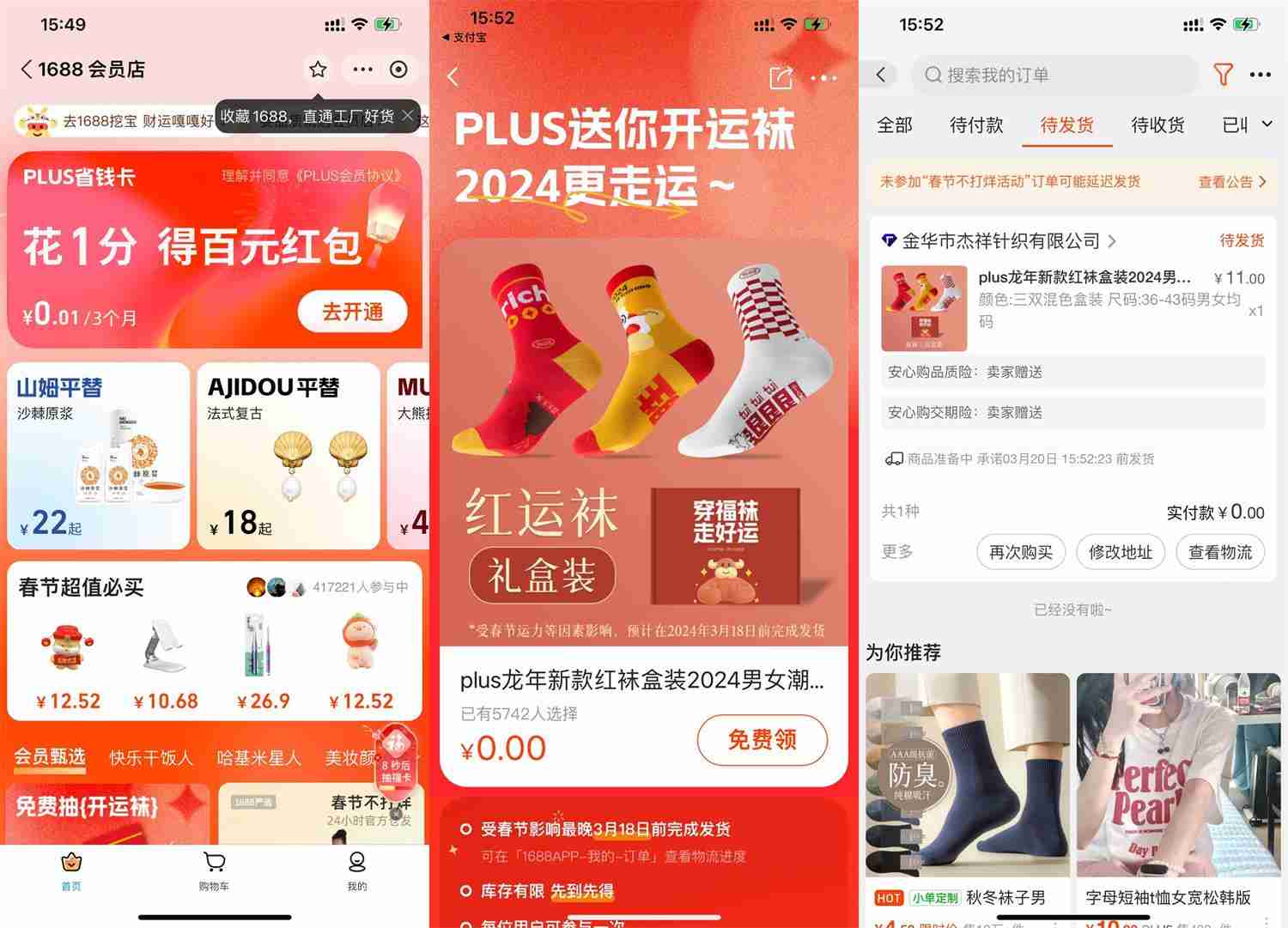 阿里巴巴0.01亓撸3双袜子包邮