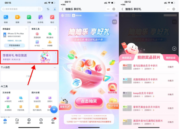移动云盘摇一摇抽立减金或会员