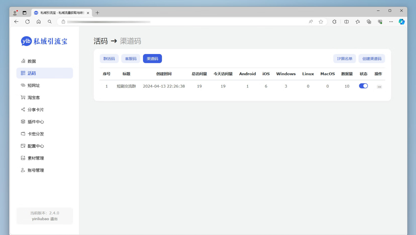 创建、编辑、删除、分享渠道码,分享可创建短链接可记录渠道来源APP、来源IP地址、来源操作系统来源时间,有效统计投放的渠道效果!可将IP地址加入黑名单,禁止恶意访问!可设置停用。带总访问量统计、今日访问量统计。有多个操作系统的来源数据记录,Windows\Linux\Mac0S\i0S\Android等系统都可以记录。