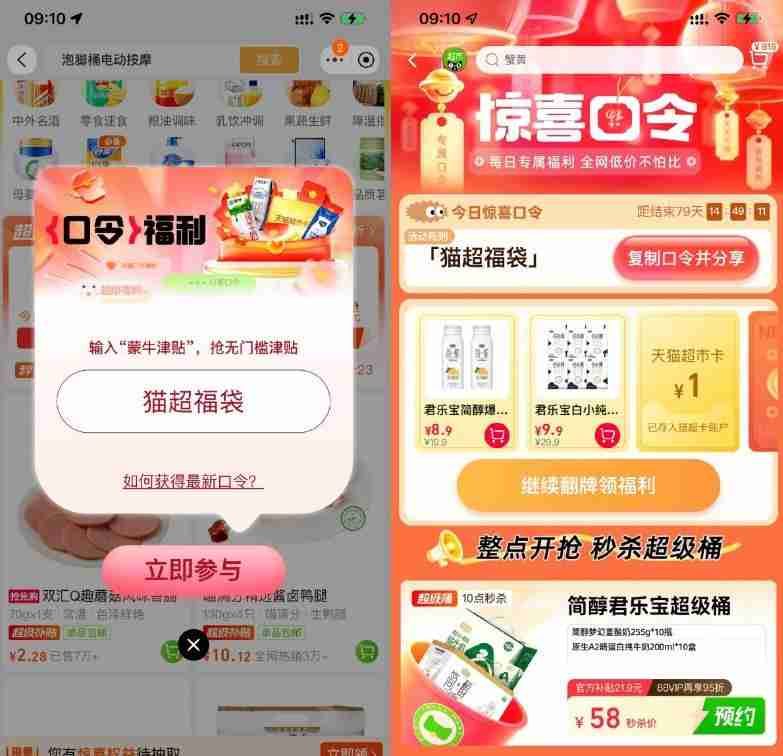 淘宝首页“天猫超市”->右下角“惊喜囗令”输入指定口令,大概率得1元猫超卡!