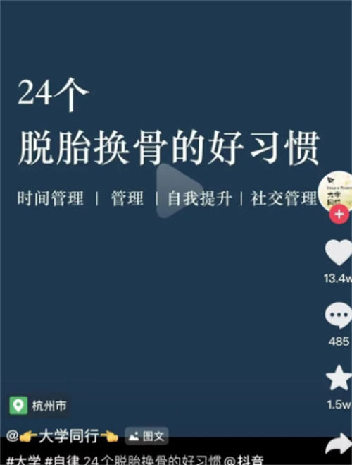 找一个空白图片,或者书单模板,直接把文字粘贴上去,这一步可以用ppt,可以用醒图,或者ps,甚至美图秀秀都可以。每天只需花1个小时,准备好5个作品素材,分批次上传即可。剩下的就是多关注几个同行,挑选出他们的爆款视频,不断地模仿和优化即可。