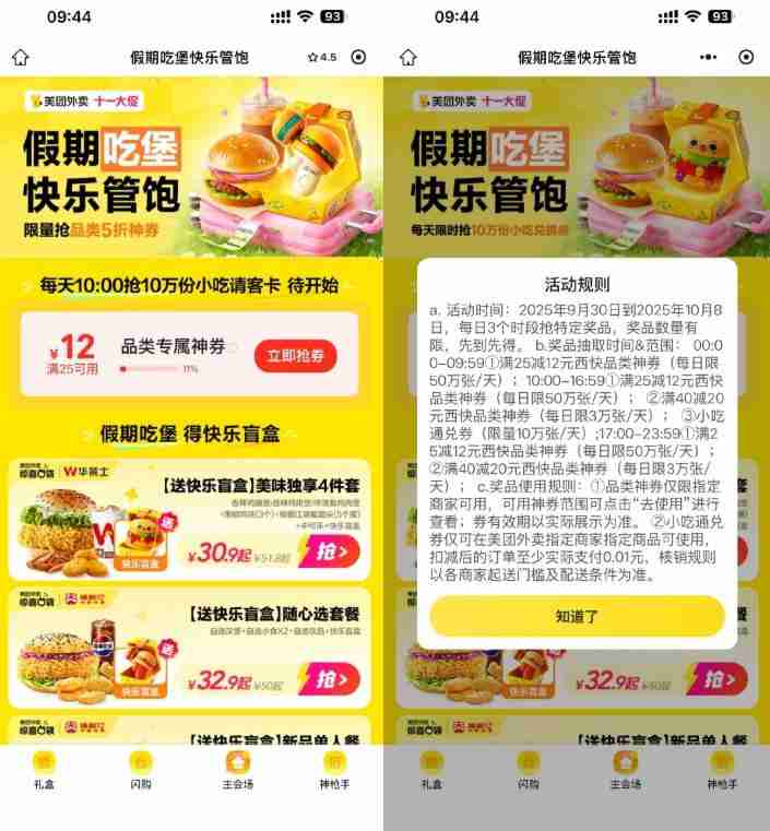 微信打开活动->9月30日~10月8日,每天10点抢10万份小吃免单券