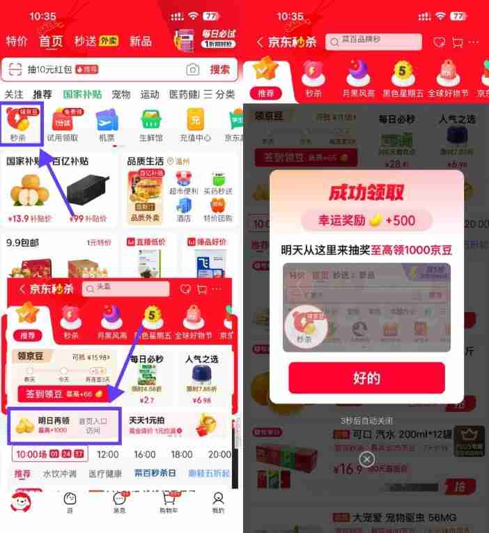 京东APP首页“秒杀”->签到下方直接领500京豆,很多人都有 自测哈