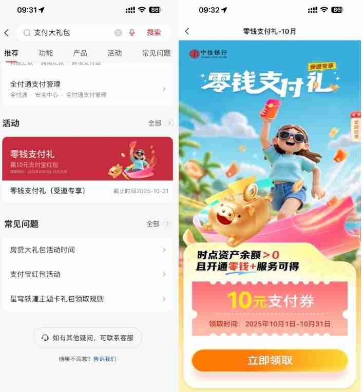 中信银行APP搜索“支付大礼包”->下拉点横幅进入->受邀用户可领10亓支付券
