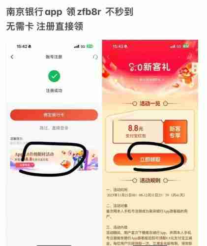 新人下载南京银行App,注册后点下方活动,或主页横幅进入活动