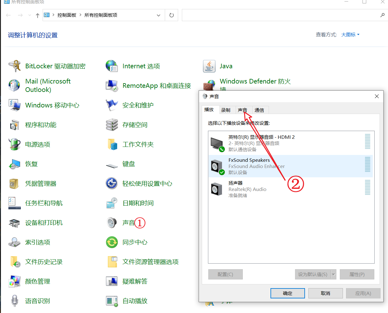 ②步骤:打开控制面板,查看方式选择“大图标”,点击声音,弹出新窗口,点击声音