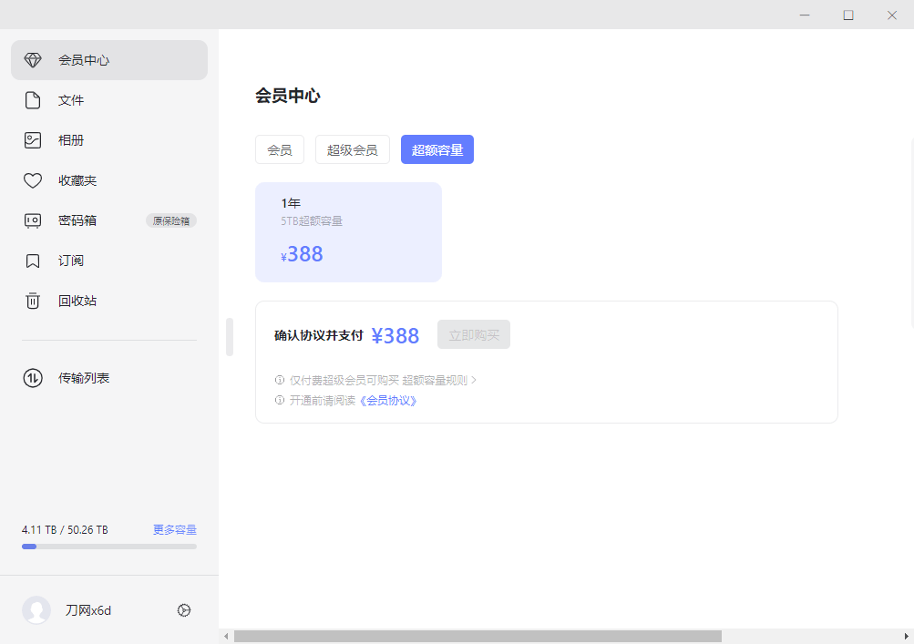 超额容量就很简单了,均为每年¥388,提供 5TB 容量,相信大部分用户很难有用到这项服务的时候。