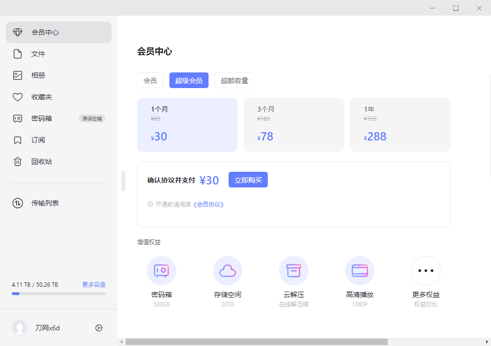 超级会员则是 1 个月¥30、 3 个月 ¥78、1 年¥288,同样支持“密码箱”“云解压”“高清播放”等,不过存储空间扩充到了 20TB。