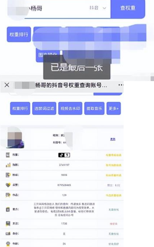 检测软件现在很多网站都能实现,原理就是把你的抖音名称或者首页链接输入进入,就会出现如下画面,我把小杨哥的输入测试了下,显示也是类似界面,就是有好几项是需要VIP才能查看。