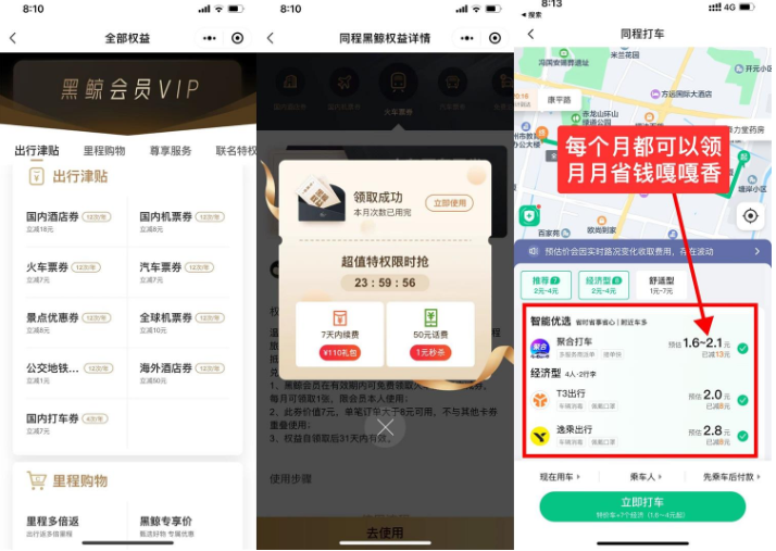 2、开通后立得20元无门槛打车/火车/酒店券 3选1!更多详细权益进去后下拉到底点黑鲸会员协议查看!各种出行优惠刚需还挺不错的!